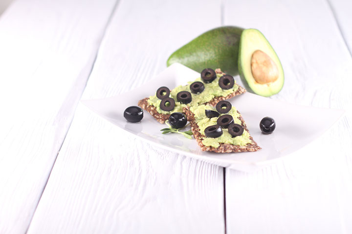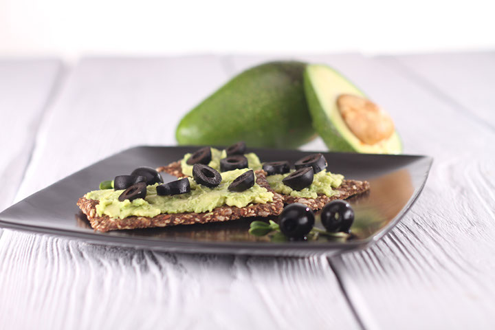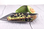 Habżyki Scheiben mit einer Avocado creme bestreichen und mit schwarzen Oliven dekorieren. Eine nette Verlockung für Gourmes