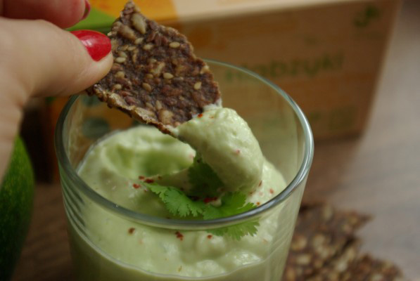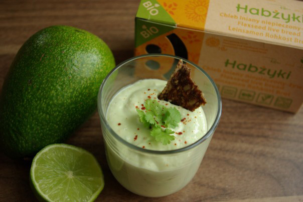 Dojrzałe awokado przekroić na pół, wyjąć pestkę, dużą łyżką wyjąć miąższ do miski albo garnka, dodać sok z limonki, dymkę, kolendrę, chilli, szczyptę soli oraz jogurt i kefir. Zmiksować wszystko na krem. Przełożyć do szklanek. Wierzch udekorować listkami kolendry oraz płatkami chilli. Podać z połamanymi Habżykami.